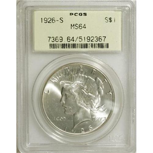 <B>1926-S $1 MS64 PCGS.</B></I> PCGS Population (1450/450). NGC Census: (1391/367). Mintage: 6,980,000. Numismedia Wsl. Price for NGC/PCGS coin in MS64: $220. (#7369)<BR><BR><b>Shipping:</b> Coins & Currency (<a target="_blank" href="http://www.heritageauctions.com/common/shipping.php">view shipping information</a>)