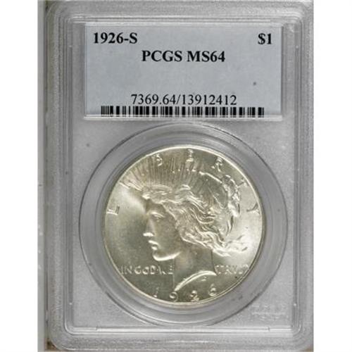 <B>1926-S $1 MS64 PCGS.</B></I> PCGS Population (1551/547). NGC Census: (1470/373). Mintage: 6,980,000. Numismedia Wsl. Price for NGC/PCGS coin in MS64: $220. (#7369)<BR><BR><B>Coin Engraver:</B> Anthony de Francisci<BR><BR><b>Shipping:</b> Coins & Currency (<a target="_blank" href="http://www.heritageauctions.com/common/shipping.php">view shipping information</a>)