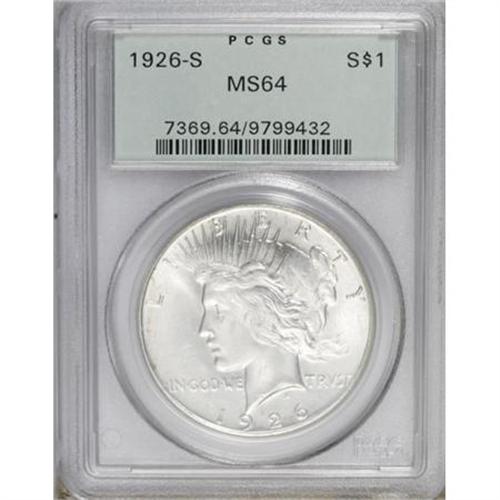 <B>1926-S $1 MS64 PCGS.</B></I> PCGS Population (1591/549). NGC Census: (1471/374). Mintage: 6,980,000. Numismedia Wsl. Price for NGC/PCGS coin in MS64: $220. (#7369)<BR><BR><B>Coin Engraver:</B> Anthony de Francisci<BR><BR><b>Shipping:</b> Coins & Currency (<a target="_blank" href="http://www.heritageauctions.com/common/shipping.php">view shipping information</a>)