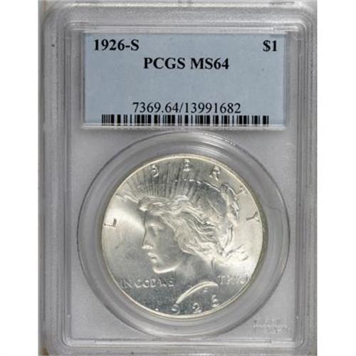 <B>1926-S $1 MS64 PCGS.</B></I> PCGS Population (1593/556). NGC Census: (1475/380). Mintage: 6,980,000. Numismedia Wsl. Price for NGC/PCGS coin in MS64: $220. (#7369)<BR><BR><B>Coin Engraver:</B> Anthony de Francisci<BR><BR><b>Shipping:</b> Coins & Currency (<a target="_blank" href="http://www.heritageauctions.com/common/shipping.php">view shipping information</a>)