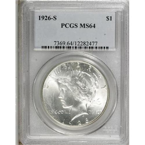 <B>1926-S $1 MS64 PCGS.</B></I> . PCGS Population (1611/566). NGC Census: (1481/381). Mintage: 6,980,000. Numismedia Wsl. Price for NGC/PCGS coin in MS64: $225. (#7369)<BR><BR><B>Coin Engraver:</B> Anthony de Francisci<BR><BR><b>Shipping:</b> Coins & Currency (<a target="_blank" href="http://www.heritageauctions.com/common/shipping.php">view shipping information</a>)