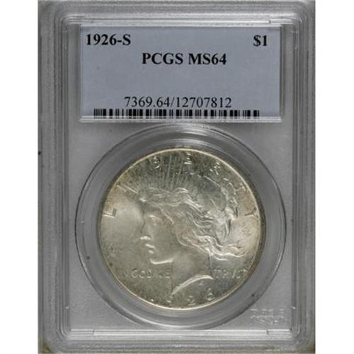 <B>1926-S $1 MS64 PCGS.</B></I> PCGS Population (1659/593). NGC Census: (1495/389). Mintage: 6,980,000. Numismedia Wsl. Price for NGC/PCGS coin in MS64: $225. (#7369)<BR><BR><B>Coin Engraver:</B> Anthony de Francisci<BR><BR><b>Shipping:</b> Coins & Currency (<a target="_blank" href="http://www.heritageauctions.com/common/shipping.php">view shipping information</a>)