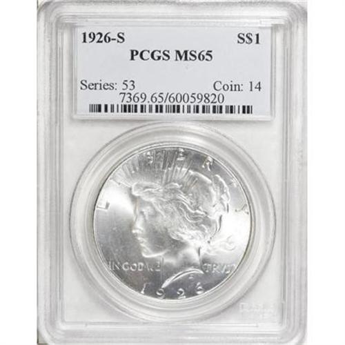 <B>1926-S $1 MS65 PCGS.</B></I> This solidly struck, carefully preserved S-mint piece comes from a mintage of just under 7 million pieces. The surfaces are practically brilliant with only a touch of gold on the vibrant obverse.<BR><BR><B>Coin Engraver:</B> Anthony de Francisci<BR><BR><b>Shipping:</b> Coins & Currency (<a target="_blank" href="http://www.heritageauctions.com/common/shipping.php">view shipping information</a>)