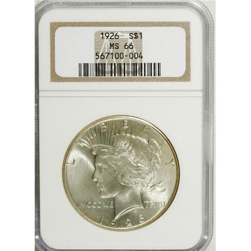 <B>1926 S$1 MS66 NGC.</B></I> Pastel powder-blue and apricot compete for territory across this lustrous and splendidly smooth Premium Gem. A good strike, and from a much lower mintage than the 1922 to 1925 Philadelphia issues. Census: 36 in 66, 1 finer (3/07).<BR><BR><b>Shipping:</b> Coins & Currency (<a target="_blank" href="http://www.heritageauctions.com/common/shipping.php">view shipping information</a>)