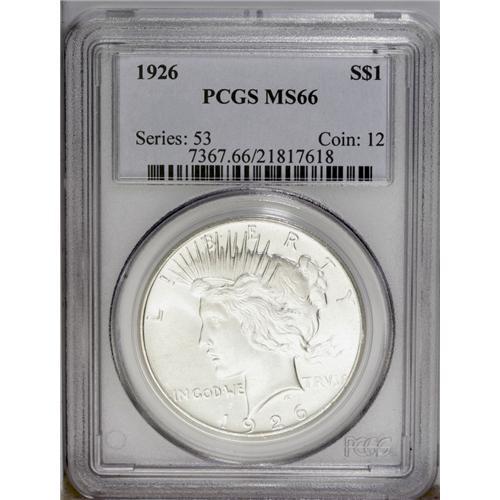 <B>1926<img border='0' src='http://www.heritagecoins.com/images/star.gif' width=10 height=10>$1> MS66 PCGS.</B></I> A sharply struck, completely untoned specimen with satiny surfaces and glowing white luster. Only the closest examination reveals some evidence of contact on Liberty's nose and some of the eagle's wing feathers.<BR><I>From The David L. Goodwin Collection.</B></I> <BR><BR><B>Important notice:</B> Heritage usually auctions material at the rate of 200-250 lots per hour. On some occasions eBay Live bid software or the Internet may not be able to keep up with the pace of the auction. We recommend placing a realistic absentee bid now as insurance to avoid disappointment. Occasionally the auctioneer may eliminate or reject an eBay Live bid, and the auctioneer may also reopen a lot after the close of the eBay live bidding (usually because we missed an audience bid), and may reject your bid even if it shows you as the winning bidder. By bidding via eBay Live, you agree that Heritage may award the lot to another bidder at its sole discretion under the circumstances described above or any other reasonable circumstances. Since eBay bids are not shown to us until we open the lot on the floor, we treat those bids just like floor bids. In most cases the floor responds before the eBay bid is presented to us, due to Internet lag time, so for consistency we have made it a policy that floor bids are always considered first over tie eBay live bids. Also please note that all Heritage lots purchased through eBay Live carry a 20% Buyer's Premium. Please make sure you read the Terms and Conditions before you bid. This lot is being auctioned in conjunction with a live floor auction by Heritage Galleries & Auctioneers. All final auction and invoice information will be supplied by Heritage Galleries & Auctioneers, and all other information should be considered preliminary. Lot:3851 <BR><BR><B>Winning Notification and Billing:</B> After the FINAL session in this auction is complete, Heritage will send e-mail and snail mail invoices. This process normally takes several days. All final auction and invoice information will be supplied by Heritage Galleries & Auctioneers, and all other information should be considered preliminary. <BR><BR>This auction will be conducted on a live auction floor and over the Internet through eBay Live. If you choose to place an absentee bid, please take a moment to <font color='#0000ff'><u><a href='http://pages.ebay.com/liveauctions/help/before/laabsentee.html'>learn how eBay Live absentee bidding works</a></u></font><font color='#000000'>