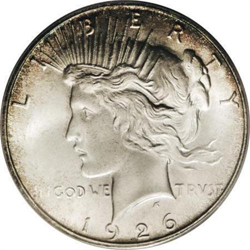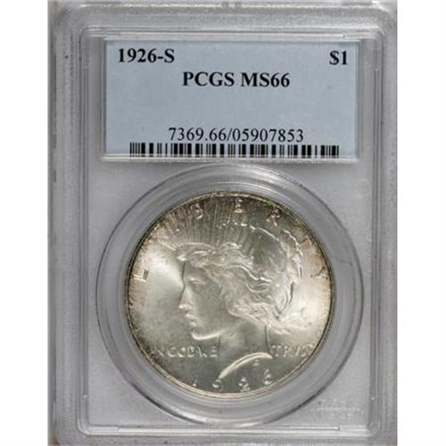 <B>1926-S $1 MS66 PCGS.</B></I> Satiny surfaces with brilliant ivory luster that is framed by hints of iridescent toning, especially on the obverse. The connoisseur will certainly appreciate the beauty of this Premium Gem, one of the finest available in the present-day numismatic marketplace. Population: 63 in 66, 2 finer (8/07).<BR><BR><B>Coin Engraver:</B> Anthony de Francisci<BR><BR><b>Shipping:</b> Coins & Currency (<a target="_blank" href="http://www.heritageauctions.com/common/shipping.php">view shipping information</a>)