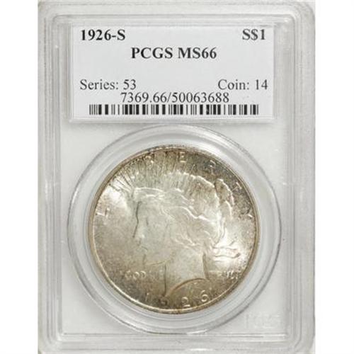 <B>1926-S $1 MS66 PCGS.</B></I> Lovely wisps of autumn-gold and emerald-green surround the largely untoned portrait. This lustrous and crisply struck Premium Gem has a remarkably clean obverse, while the reverse displays only moderate marks. The 1926-S is typically located in MS63 or MS64 grades, and is rare at the MS66 level. Population: 63 in 66, 2 finer (10/07).<BR><BR><B>Coin Engraver:</B> Anthony de Francisci<BR><BR><b>Shipping:</b> Coins & Currency (<a target="_blank" href="http://www.heritageauctions.com/common/shipping.php">view shipping information</a>)