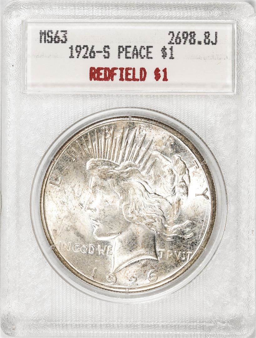 One 1926-S $1 Peace Silver Dollar Coin Blanchard MS63 Redfield Holder.