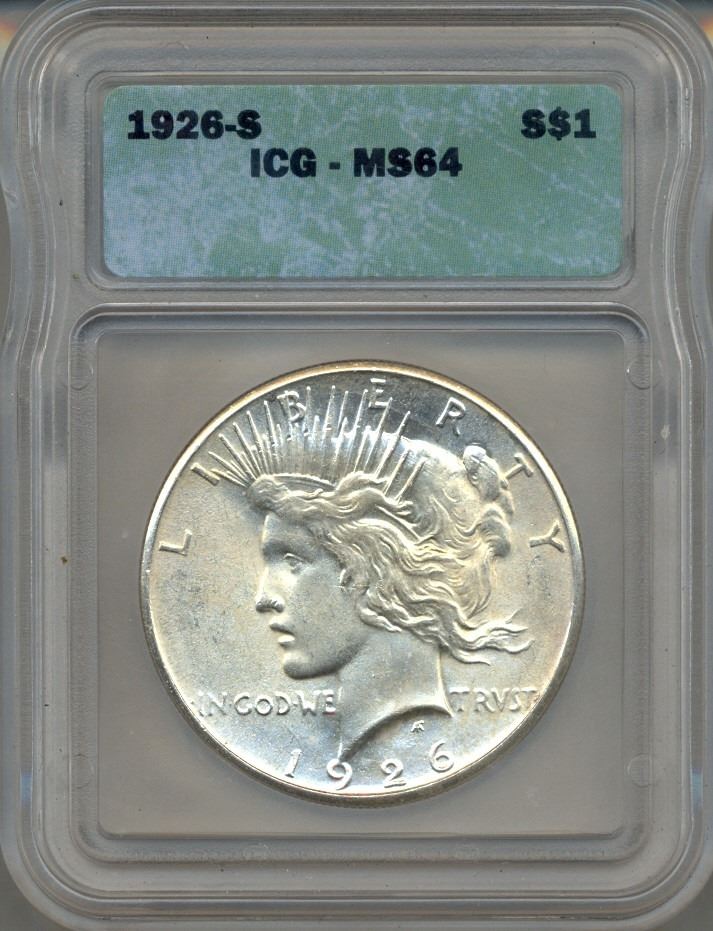 One 1926-S $1 Peace Silver Dollar Coin ICG MS64.