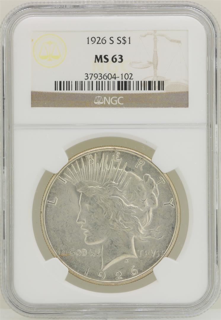 One 1926-S $1 Peace Silver Dollar Coin NGC MS63. NGC Certified.