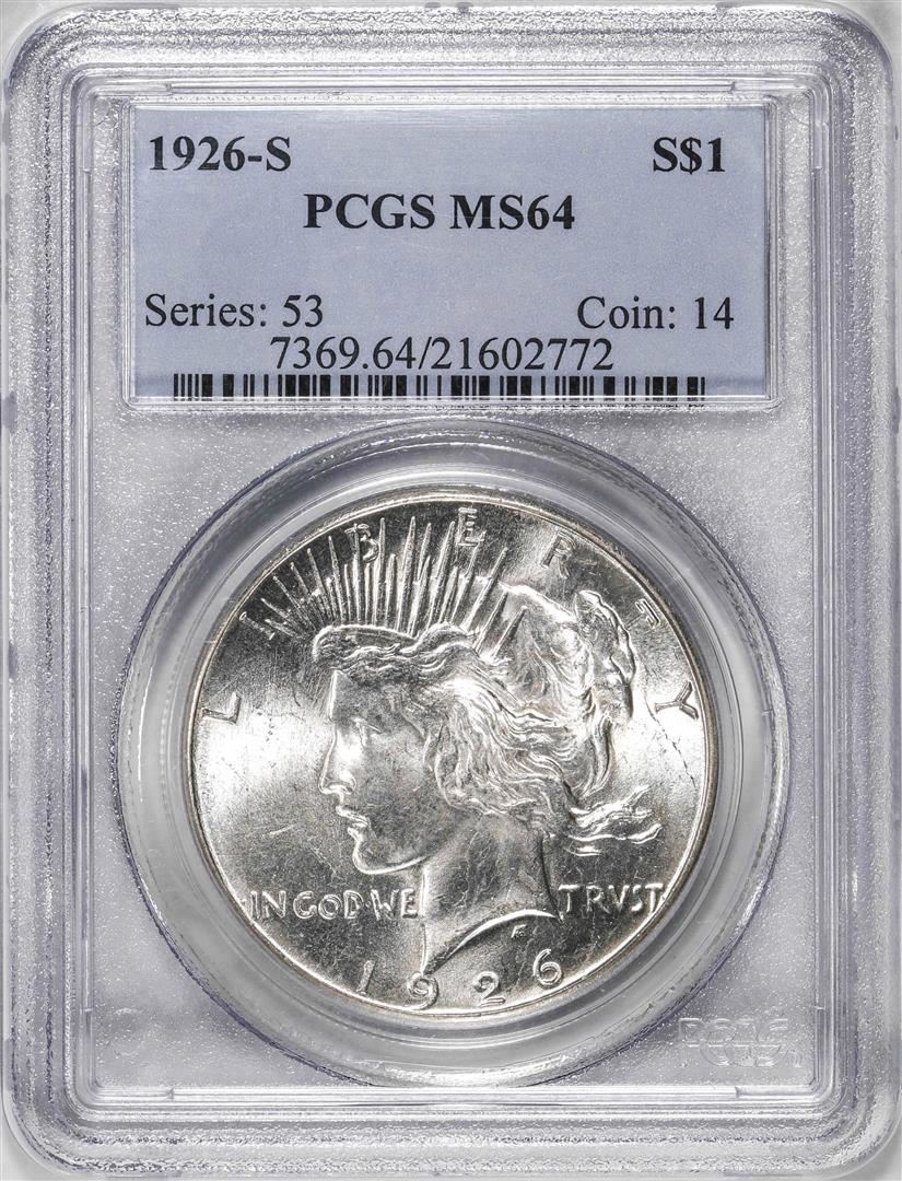 One 1926-S $1 Peace Silver Dollar Coin PCGS MS64. PCGS Graded.