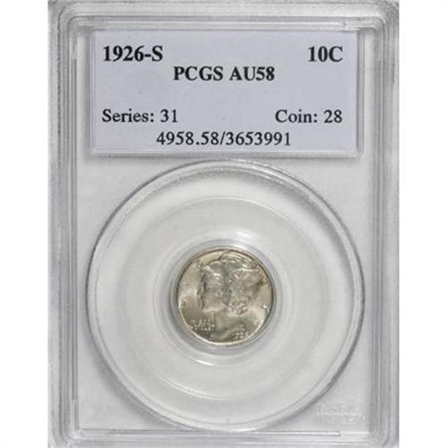 <B>1926-S 10C AU58 PCGS.</B></I> This strong near-Mint example displays seemingly full satiny luster, and also seems to show fully split bands, a scarce commodity for the issue. Lightly toned in champagne-gray over both sides, and lacking either highpoint wear or noticeable surface blemishes. A conservatively graded specimen. <BR><BR><B>Coin Engraver:</B> Adolph A. Weinman<BR><BR><b>Shipping:</b> Coins & Currency (<a target="_blank" href="http://www.heritageauctions.com/common/shipping.php">view shipping information</a>)