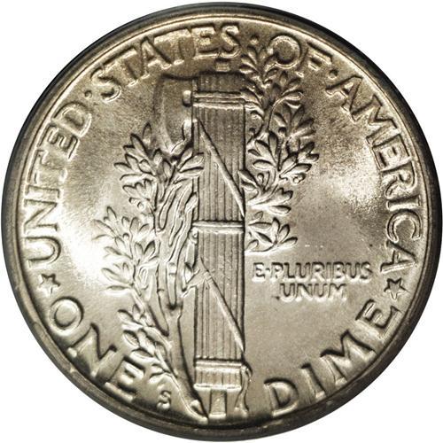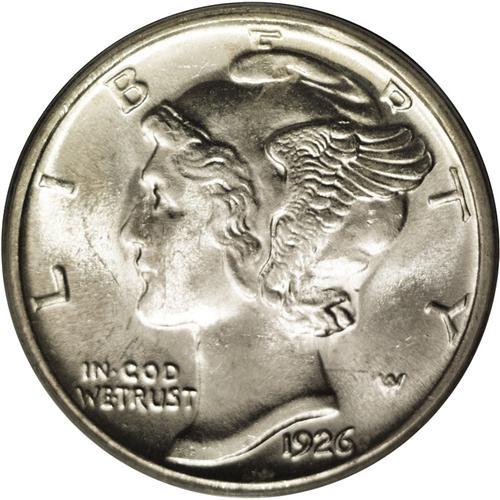 <B>1926-S<10C> MS64 Full Bands PCGS.</B></I> A radiant, boldly struck example with the slightest blush of golden color here and there. Only a faint vertical facial scratch seems to preclude a Gem designation. A lengthy die crack running down the portrait does not affect the grade. The 1926-S Mercury is well deserving of its key issue status in Choice and better condition, especially when located with full bands definition. Population: 45 in 64, 36 finer (4/06).