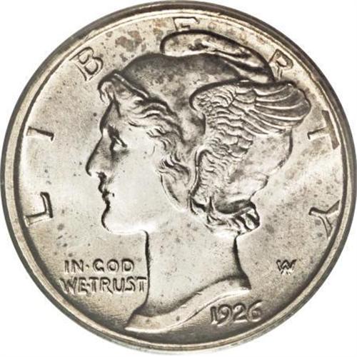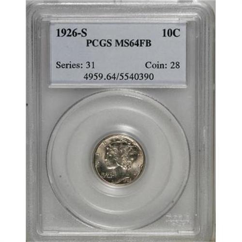 <B>1926-S 10C MS64 Full Bands PCGS.</B></I> Gem Full Bands examples of the 1926-S are among the most elusive issues of the entire Mercury dime series. The 1926-S date is, of course, a popular one in every minor coin series. This piece offers lustrous silver centers lightly kissed with gold and ice-blue. A couple of horizontal abrasions on the lower fasces are the only singular contact. Population: 46 in 64 Full Bands, 36 finer (3/08).<BR><BR><B>Coin Engraver:</B> Adolph A. Weinman<BR><BR><b>Shipping:</b> Coins & Currency (<a target="_blank" href="http://www.heritageauctions.com/common/shipping.php">view shipping information</a>)