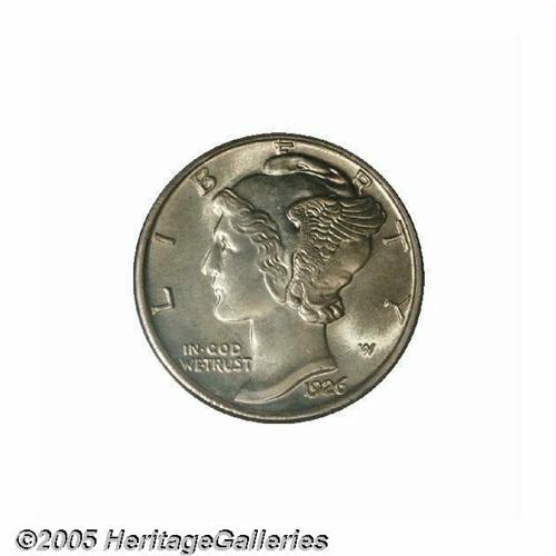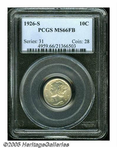 <B>1926-S<10C> MS66 Full Bands PCGS.</B></I> The 1926-S dime is one of the most sought-after rarities in the Mercury dime series in Gem condition and with full definition on the crossbands. Lange compares the 1926-S to the 1918-S, 1919-D, and 1919-S in upper grades. Of course, the low mintage of this issue also adds to its overall rarity and desirability as only 1.52 million pieces were struck, making the '26-S a scarce coin in AU55 and better grades. Impaired coins are also a problem for the collector who seeks a pleasing, problem-free example. This particular coin is notably free from any type of problems. The mint luster is thick and frosted while each side is evenly coated with golden toning. A stunning example of this absolute, condition, and strike rarity from the 1920s. Population: 15 in 66, 0 finer (6/05).