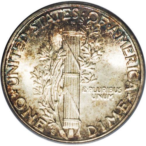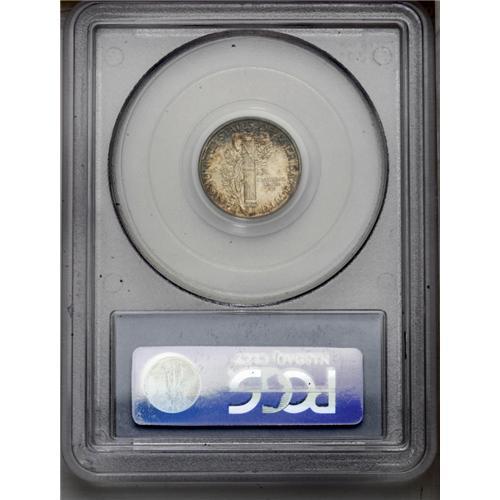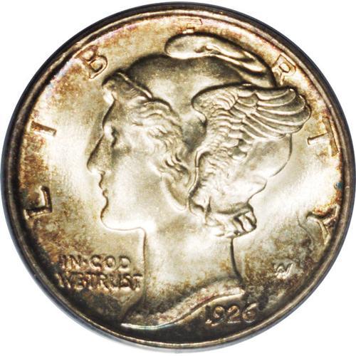 <B>1926-S<10C> MS66 Full Bands PCGS.</B></I> The Mercury dime series is replete with expensive issues in top grade, but few command the widespread respect accorded to the 1926-S. Even a properly graded AU has a high catalog value and is nearly impossible to locate. Its mintage of 1.52 million pieces is fifth lowest in the series, one of those with a lower mintage being the comparatively common '31-D. This remarkably preserved example is basically untoned through the centers and is accented with rich antique-gold and aqua-blue peripheral toning. Add to the technical and visual merits an especially bold strike and the result of one of the finest '26-S dimes certified to date. Population: 14 in 66, 2 finer (3/06).