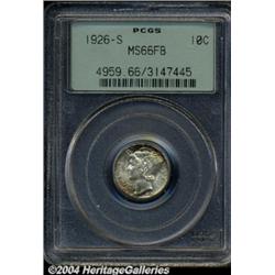 <B>1926-S<10C> MS66 Full Bands PCGS.</B></I> The 1926-S is very rare in higher Mint State condition, with or without full bands. The present Premium Gem is sharply struck, not just on the bands, but throughout most of the design elements. Only a couple of the peripheral reverse letters reveal softness. Highly lustrous, with splashes of gold, crimson, and aqua toning. Pristine surfaces are virtually free of abrasions. Population: 14 in 66, 0 finer (7/04).<BR><I>From The Reed Hawn Collection of Mercury Dimes.</B></I> <BR><BR><B>Important notice:</B> Heritage usually auctions material at the rate of 200-250 lots per hour. On some occasions eBay Live bid software or the Internet may not be able to keep up with the pace of the auction. We recommend placing a realistic absentee bid now as insurance to avoid disappointment. Occasionally the auctioneer may eliminate or reject an eBay Live bid, and the auctioneer may also reopen a lot after the close of the eBay live bidding (usually because we missed an audience bid), and may reject your bid even if it shows you as the winning bidder. By bidding via eBay Live, you agree that Heritage may award the lot to another bidder at its sole discretion under the circumstances described above or any other reasonable circumstances. Since eBay bids are not shown to us until we open the lot on the floor, we treat those bids just like floor bids. In most cases the floor responds before the eBay bid is presented to us, due to Internet lag time, so for consistency we have made it a policy that floor bids are always considered first over tie eBay live bids. Also please note that all Heritage lots purchased through eBay Live carry a 20% Buyer's Premium. Please make sure you read the Terms and Conditions before you bid. </span></font></tr></table></td></tr></table>