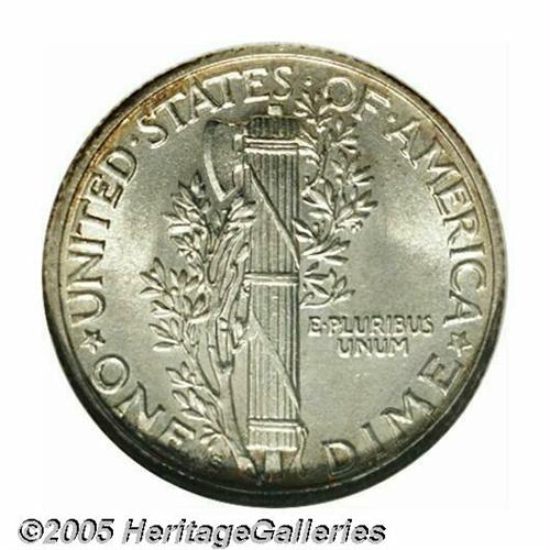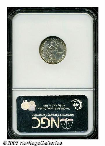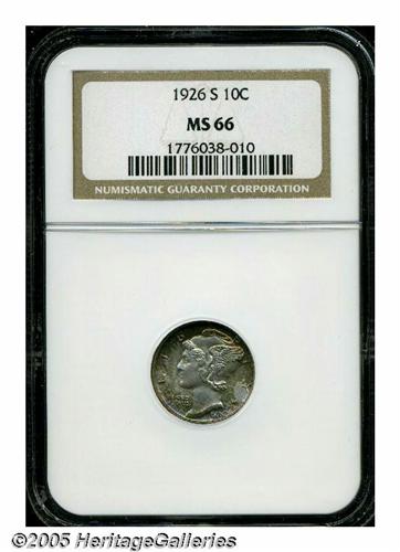 <B>1926-S<10C> MS66 NGC.</B></I> Lange indicates in his <I>The Complete Guide to Mercury Dimes</B></I> that "Choice and Gem specimens, even those having merely split bands, are frustratingly rare," and that "a full bands Gem of this date is easily among the most difficult coins in the entire series to locate." The middle horizontal bands on the fasces of this Premium Gem example are indeed split, but do not have quite the degree of relief for "Full Bands" designation. The overall shrike quality of the piece is excellent. Its lustrous surfaces on the obverse are mottled in sea-green, burnt-orange, crimson, and violet coloration, while the reverse is nearly untoned, but for whispers of gold color at the margins. There are no superficial impairments to report. Population: 3 in 66, 2 finer (4/05).