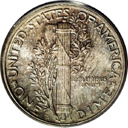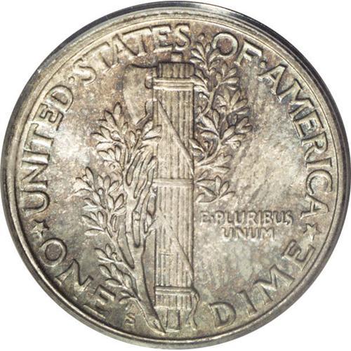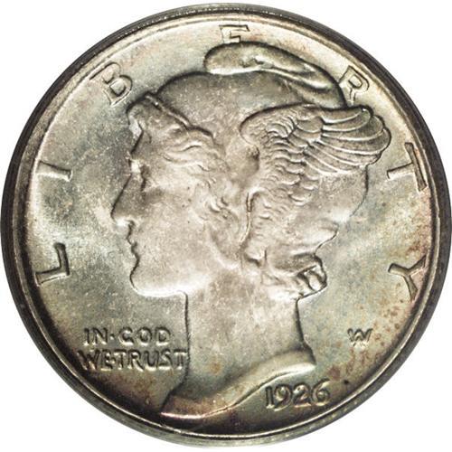 <B>1926-S<10C> MS66 PCGS.</B></I> While the 1926-S is fairly common in grades Good through Fine, higher-grade circulated pieces are scarce, and Mint State coins are quite difficult to locate. PCGS and NGC have certified fewer than 160 Uncirculated examples, of which less than 10 fall into the Premium Gem category, and no more than five grade finer. Moreover, this is one of the most difficult coins in the entire series to locate with full bands. The current MS66 piece is sharply struck, and while the middle bands are not fully rounded, they are nearly split. Lustrous surfaces display a blend of cobalt-blue, gold-tan, and lavender patination. A few minor handling marks on the cheek and neck do not detract from the overall eye appeal of this highly desirable specimen. Population: 5 in 66, 1 finer (6/06).