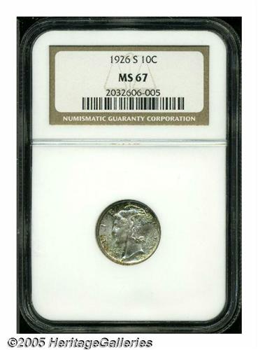 <B>1926-S<10C> MS67 NGC.</B></I> Sharply struck save for a little bit of bluntness in the center of the reverse, this lustrous Superb Gem displays some mottled olive-green and crimson-red iridescence overall. The underlying fields are frosty and exceptionally smooth. We are unable to find more than a single tiny abrasion, that being on Liberty's neck. Population: 2 in 67, 0 finer (4/05).