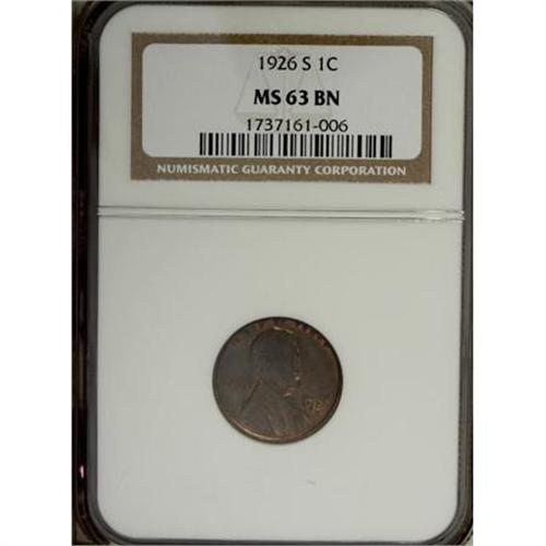 <B>1926-S 1C MS63 Brown NGC.</B></I> NGC Census: (43/54). PCGS Population (47/28). Mintage: 4,550,000. Numismedia Wsl. Price for NGC/PCGS coin in MS63: $175. (#2573)<BR><BR><B>Coin Engraver:</B> Victor D. Brenner<BR><BR><b>Shipping:</b> Coins & Currency (<a target="_blank" href="http://www.heritageauctions.com/common/shipping.php">view shipping information</a>)