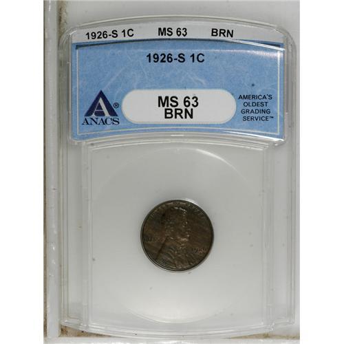 <B>1926-S 1C MS63 Brown ANACS.</B></I> NGC Census: (42/53). PCGS Population (40/25). Mintage: 4,550,000. Numismedia Wsl. Price for NGC/PCGS coin in MS63: $175. (#2573)<BR><BR><b>Shipping:</b> Coins & Currency (<a target="_blank" href="http://www.heritageauctions.com/common/shipping.php">view shipping information</a>)