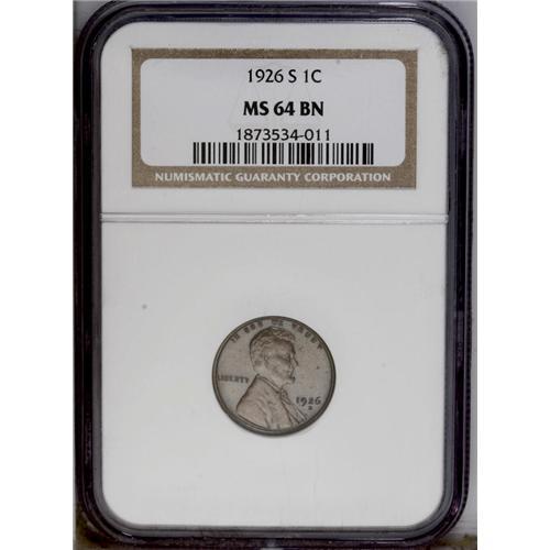 <B>1926-S<1C> MS64 Brown NGC.</B></I> Semi-glossy medium brown surfaces are imbued with whispers of bluish and violet, and the design features are well impressed. A few minute marks define the grade. Census: 44 in 64, 6 finer (3/06). <BR><BR><B>Important notice:</B> Heritage usually auctions material at the rate of 200-250 lots per hour. On some occasions eBay Live bid software or the Internet may not be able to keep up with the pace of the auction. We recommend placing a realistic absentee bid now as insurance to avoid disappointment. Occasionally the auctioneer may eliminate or reject an eBay Live bid, and the auctioneer may also reopen a lot after the close of the eBay live bidding (usually because we missed an audience bid), and may reject your bid even if it shows you as the winning bidder. By bidding via eBay Live, you agree that Heritage may award the lot to another bidder at its sole discretion under the circumstances described above or any other reasonable circumstances. Since eBay bids are not shown to us until we open the lot on the floor, we treat those bids just like floor bids. In most cases the floor responds before the eBay bid is presented to us, due to Internet lag time, so for consistency we have made it a policy that floor bids are always considered first over tie eBay live bids. Also please note that all Heritage lots purchased through eBay Live carry a 20% Buyer's Premium. Please make sure you read the Terms and Conditions before you bid. This lot is being auctioned in conjunction with a live floor auction by Heritage Galleries & Auctioneers. All final auction and invoice information will be supplied by Heritage Galleries & Auctioneers, and all other information should be considered preliminary. Lot:649 <BR><BR><B>Winning Notification and Billing:</B> After the FINAL session in this auction is complete, Heritage will send e-mail and snail mail invoices. This process normally takes several days. All final auction and invoice information will be supplied by Heritage Galleries & Auctioneers, and all other information should be considered preliminary. <BR><BR>This auction will be conducted on a live auction floor and over the Internet through eBay Live. If you choose to place an absentee bid, please take a moment to <font color='#0000ff'><u><a href='http://pages.ebay.com/liveauctions/help/before/laabsentee.html'>learn how eBay Live absentee bidding works</a></u></font><font color='#000000'>