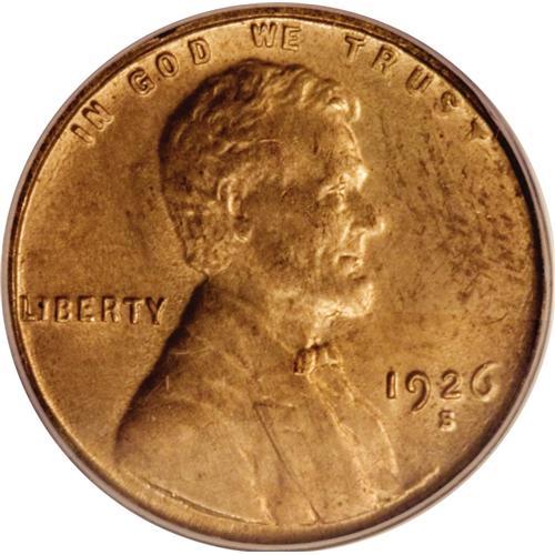 <B>1926-S 1C MS64 Red PCGS.</B></I> A highly respected, semi-key issue with a mintage of only 4.55 million pieces. Full Red coins are difficult in all grades, but especially so in MS64, and MS65 examples are almost non-existent. This is a bright orange-red coin that shows numerous light die striations in the reverse fields that impart extra vibrancy. Just the slightest specks of carbon prevent an even higher grade. Population: 67 in 64, 1 finer (3/07).<BR><BR><b>Shipping:</b> Coins & Currency (<a target="_blank" href="http://www.heritageauctions.com/common/shipping.php">view shipping information</a>)