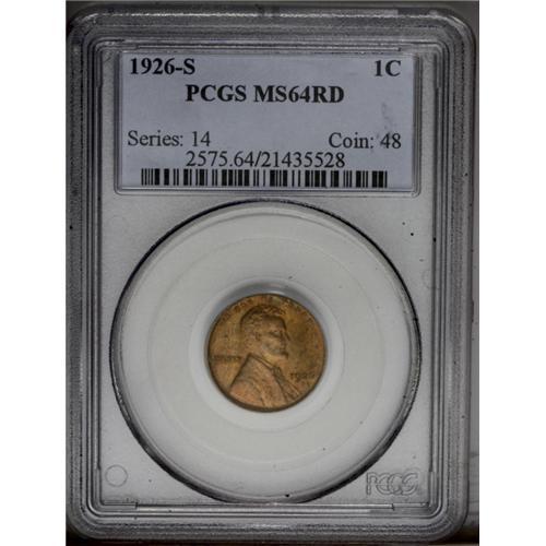 <B>1926-S<1C> MS64 Red PCGS.</B></I> The mintage of 4.5 million pieces is only a partial indicator of the rarity of this issue. It is very scarce with full red color and high grade examples are seldom seen. This piece has somewhat mottled, slightly mellowed, original color. Close examination reveals a few tiny abrasions but the surfaces are virtually carbon-free. Population: 64 in 64, 1 finer (3/06).<BR><I>From The Kendall Marie #4 All-Time Finest PCGS Registry of Lincoln Cents with Varieties, Circulation Strikes, 1909-1958.</B></I> <BR><BR><B>Important notice:</B> Heritage usually auctions material at the rate of 200-250 lots per hour. On some occasions eBay Live bid software or the Internet may not be able to keep up with the pace of the auction. We recommend placing a realistic absentee bid now as insurance to avoid disappointment. Occasionally the auctioneer may eliminate or reject an eBay Live bid, and the auctioneer may also reopen a lot after the close of the eBay live bidding (usually because we missed an audience bid), and may reject your bid even if it shows you as the winning bidder. By bidding via eBay Live, you agree that Heritage may award the lot to another bidder at its sole discretion under the circumstances described above or any other reasonable circumstances. Since eBay bids are not shown to us until we open the lot on the floor, we treat those bids just like floor bids. In most cases the floor responds before the eBay bid is presented to us, due to Internet lag time, so for consistency we have made it a policy that floor bids are always considered first over tie eBay live bids. Also please note that all Heritage lots purchased through eBay Live carry a 20% Buyer's Premium. Please make sure you read the Terms and Conditions before you bid. This lot is being auctioned in conjunction with a live floor auction by Heritage Galleries & Auctioneers. All final auction and invoice information will be supplied by Heritage Galleries & Auctioneers, and all other information should be considered preliminary. Lot:517 <BR><BR><B>Winning Notification and Billing:</B> After the FINAL session in this auction is complete, Heritage will send e-mail and snail mail invoices. This process normally takes several days. All final auction and invoice information will be supplied by Heritage Galleries & Auctioneers, and all other information should be considered preliminary. <BR><BR>This auction will be conducted on a live auction floor and over the Internet through eBay Live. If you choose to place an absentee bid, please take a moment to <font color='#0000ff'><u><a href='http://pages.ebay.com/liveauctions/help/before/laabsentee.html'>learn how eBay Live absentee bidding works</a></u></font><font color='#000000'>