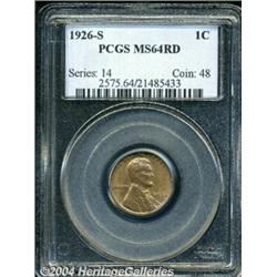<B>1926-S<1C> MS64 Red PCGS.</B></I> A well known condition rarity, the typical Mint State 1926-S Cent is either sharply struck with incomplete luster, or softly impressed with full luster. Coins that combine both qualities are rare and seldom offered in today's market. This is an important near-Gem with virtually no areas of mentionable striking softness. The luster is intact with golden-red color and a few overlying magenta speckles. There are no blemishes that are out of context with the assigned grade. With only one MS65 Red example known to PCGS (7/04), specialists would be wise to take full advantage of the opportunity that this Choice quality survivor represents. <BR><BR><B>Important notice:</B> Heritage usually auctions material at the rate of 200-250 lots per hour. On some occasions eBay Live bid software or the Internet may not be able to keep up with the pace of the auction. We recommend placing a realistic absentee bid now as insurance to avoid disappointment. Occasionally the auctioneer may eliminate or reject an eBay Live bid, and the auctioneer may also reopen a lot after the close of the eBay live bidding (usually because we missed an audience bid), and may reject your bid even if it shows you as the winning bidder. By bidding via eBay Live, you agree that Heritage may award the lot to another bidder at its sole discretion under the circumstances described above or any other reasonable circumstances. Since eBay bids are not shown to us until we open the lot on the floor, we treat those bids just like floor bids. In most cases the floor responds before the eBay bid is presented to us, due to Internet lag time, so for consistency we have made it a policy that floor bids are always considered first over tie eBay live bids. Also please note that all Heritage lots purchased through eBay Live carry a 20% Buyer's Premium. Please make sure you read the Terms and Conditions before you bid. </span></font></tr></table></td></tr></table>