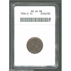 1926-S 1C MS64 Red and Brown ANACS. The luminous orange and gold color has wisps of steel-blue on the reverse. A well struck and beautifully preserved near-Gem. The lowest mintage issue of the Roaring Twenties. Important notice: We expect to be auctioning lots at the rate of 200-250 per hour. Sometimes eBay Premier live bid software cannot keep up with that pace, so we strongly recommend that you place a realistic proxy bid now as insurance to avoid disappointment. Also please note that all Heritage/CAA lots purchased through eBay Premier carry a 20% Buyer's Premium. Please make sure you read the Terms and Conditions.