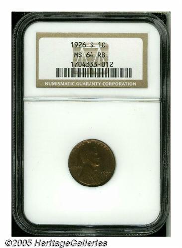 <B>1926-S<1C> MS64 Red and Brown NGC.</B></I> Nice, attractive slightly faded mint red color, and struck better than the typical San Francisco Mint issues of the 1920's. This is a very pleasing specimen of this scarcer date.