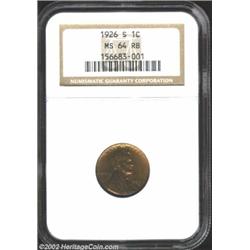 1926-S 1C MS64 Red and Brown NGC. The fiery-red surfaces of this attractive near-Gem are only slightly faded to a medium tan, and the strike is outstanding for the issue--even the often weak central lettering on the reverse is fully brought up. Only a few small abrasions are noticed. An above average example for the grade and for the issue.From the Robert Tarr, Sr. Collection. Important notice: We expect to be auctioning lots at the rate of 200-250 per hour. Sometimes eBay Premier live bid software cannot keep up with that pace, so we strongly recommend that you place a realistic proxy bid now as insurance to avoid disappointment. Also please note that all Heritage/CAA lots purchased through eBay Premier carry a 20% Buyer's Premium. Please make sure you read the Terms and Conditions.