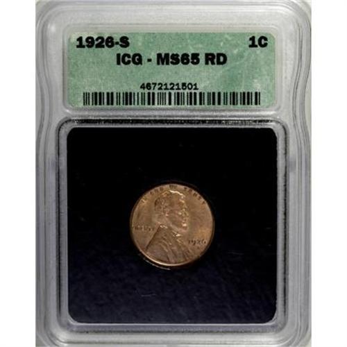 <B>1926-S 1C MS65 Red ICG.</B></I> The 1926-S is a well-known semikey Lincoln cent issue from the 1920s, but it is extremely rare in grades approaching MS65, and full red color further compounds the rarity factor. This is a well struck example that has lovely, original red surfaces. The obverse is lighter overall, with a few trivial carbon flecks noted under a loupe. The reverse is a tad deeper in color, with cherry-red patina in the centers deepening to fuchsia at the rims. Lincoln cents of all stripes have been showing increased collector interest in recent months, likely due to the impending Lincoln special Mint issues planned for 2009 to commemorate Lincoln's birth bicentennial. As such, and as a standalone rarity in its own right, this piece is worthy of a strong bid from serious Lincoln cent specialists.<BR><BR><B>Coin Engraver:</B> Victor D. Brenner<BR><BR><b>Shipping:</b> Coins & Currency (<a target="_blank" href="http://www.heritageauctions.com/common/shipping.php">view shipping information</a>)