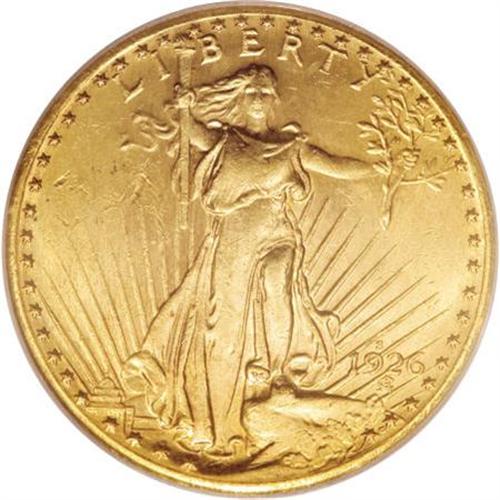 <B>1926-S $20 MS62 PCGS.</B></I> This piece is a collectible example of an issue that was formerly scarce, and yet today is much more widely available. This coin shows a few scrapes in the fields and light contact marks that account for the grade, yet it retains significant charm, with extremely lustrous yellow-gold surfaces and a reverse that appear choice for the grade. Some of the mythic appeal of its former glory remains, and it is also numismatically fascinating as the only U.S. gold coin of any denomination dated 1926-S. <BR><BR><b>Shipping:</b> Coins & Currency (<a target="_blank" href="http://www.heritageauctions.com/common/shipping.php">view shipping information</a>)