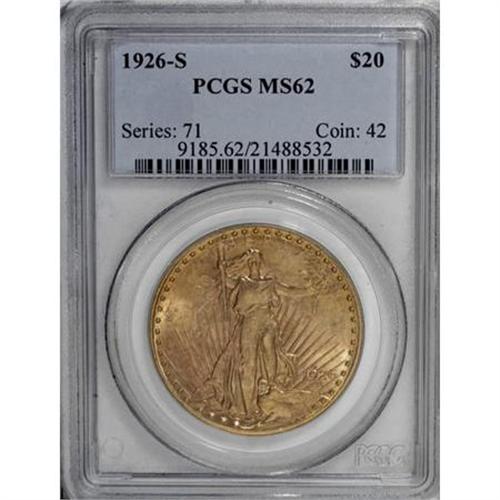 <B>1926-S $20 MS62 PCGS.</B></I> Formerly considered a great rarity, the 1926-S in more recent times has seen a number of specimens repatriated from overseas hoards, mostly in the lower Mint State grades. This piece shows the typically high production standards of the issue, with a bold strike and frosty, lustrous surfaces that show a few grade-consistent abrasions.<BR><BR><b>Shipping:</b> Coins & Currency (<a target="_blank" href="http://www.heritageauctions.com/common/shipping.php">view shipping information</a>)