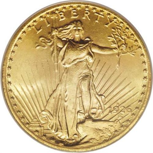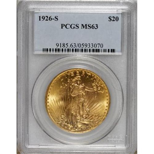 <B>1926-S $20 MS63 PCGS.</B></I> Despite a mintage of over 2 million pieces, the 1926-S is less available in all grades than its P-mint counterpart. This strongly lustrous yellow-gold example has hints of green-gold color in the fields. The strike is sharp, and only light, scattered marks affect the obverse, though the reverse has slightly more significant abrasions. Still, an appealing representative.<BR><BR><b>Shipping:</b> Coins & Currency (<a target="_blank" href="http://www.heritageauctions.com/common/shipping.php">view shipping information</a>)