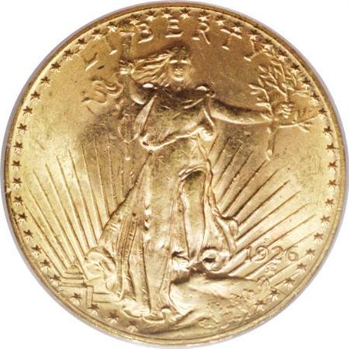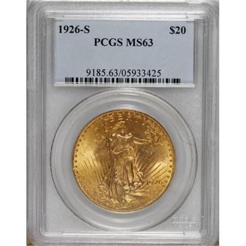 <B>1926-S $20 MS63 PCGS.</B></I> Found in substantial numbers in European holdings, the 1926-S is now one of the most frequently encountered mintmarked issues from the 1920s. This piece has rich frosted surfaces and show a noticeably deeper orange hue around the margins. Sharply struck. Each side has only slight abrasions, none of which deserve individual mention.<BR><BR><b>Shipping:</b> Coins & Currency (<a target="_blank" href="http://www.heritageauctions.com/common/shipping.php">view shipping information</a>)