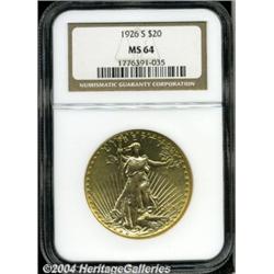 <B>1926-S<$20> MS64 NGC.</B></I> While the 1926-S was considered a key issue fifty years ago, today it is the most frequently encountered of the branch mint issues struck between 1924 and 1927. While always available for a price in lower grades, Choice examples are still elusive and worthy of consideration by the advanced collector. This is a very attractive piece that has bright, sparkling mint luster and a rich overlay of reddish patina. The only noticeable mark is a horizontal abrasion at the bottom of the olive branch on the right side of the obverse.<BR><I>From The Sarasota Collection.</B></I> <BR><BR><B>Important notice:</B> Heritage usually auctions material at the rate of 200-250 lots per hour. On some occasions eBay Live bid software or the Internet may not be able to keep up with the pace of the auction. We recommend placing a realistic absentee bid now as insurance to avoid disappointment. Occasionally the auctioneer may eliminate or reject an eBay Live bid, and the auctioneer may also reopen a lot after the close of the eBay live bidding (usually because we missed an audience bid), and may reject your bid even if it shows you as the winning bidder. By bidding via eBay Live, you agree that Heritage may award the lot to another bidder at its sole discretion under the circumstances described above or any other reasonable circumstances. Since eBay bids are not shown to us until we open the lot on the floor, we treat those bids just like floor bids. In most cases the floor responds before the eBay bid is presented to us, due to Internet lag time, so for consistency we have made it a policy that floor bids are always considered first over tie eBay live bids. Also please note that all Heritage lots purchased through eBay Live carry a 20% Buyer's Premium. Please make sure you read the Terms and Conditions before you bid. </span></font></tr></table></td></tr></table>
