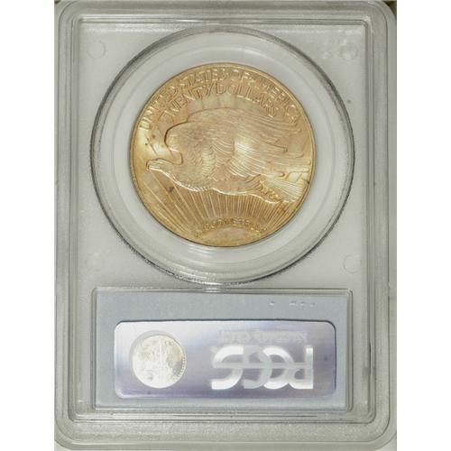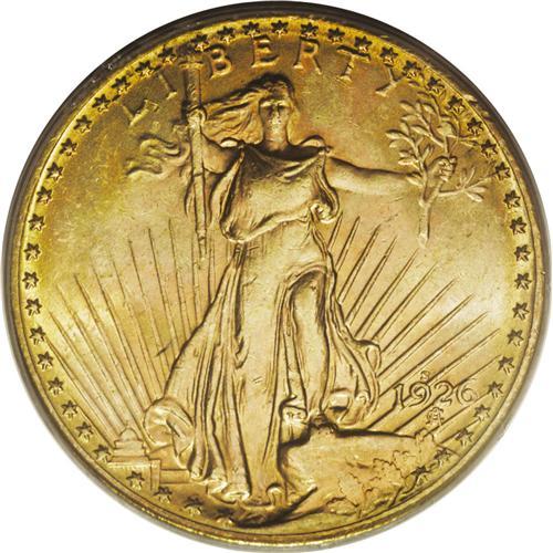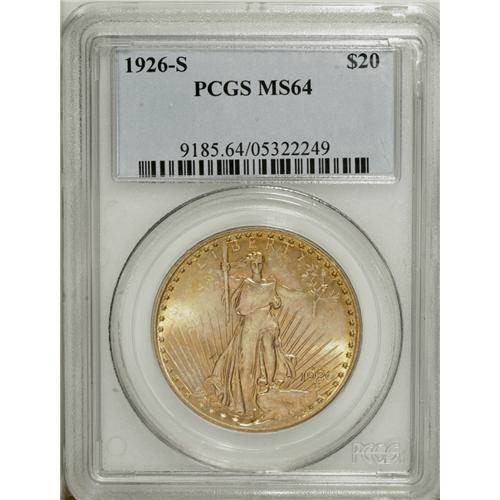 <B>1926-S $20 MS64 PCGS.</B></I> A highly lustrous example that is generally lighter yellow in color with considerable honey-gold toning in the protected areas of each side. There are a few light surface marks are evident on each side, strictly consistent with the grade, and a small, curly-cued fragment connects to the 2 in the date. The 1926-S is one of many mass-melted branch mint issues from the 1920s and a prized rarity any finer.<BR><BR><b>Shipping:</b> Coin/Currency (<a target="_blank" href="http://www.heritageauctions.com/common/shipping.php">view shipping information</a>)