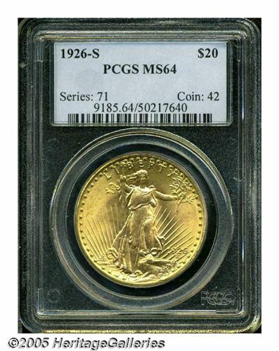 <B>1926-S<$20> MS64 PCGS.</B></I> The 1926-S is a scarcer issue that was once regarded as one of the keys to the Saint-Gaudens series. However, in the 1950s and '60s substantial numbers of Mint State pieces turned up in Europe. This fully lustrous example is well defined, exceptionally bright, and would easily qualify at the Gem level, but for several minor marks on each side.