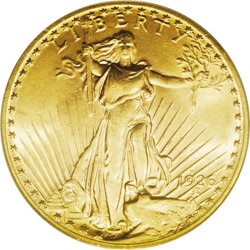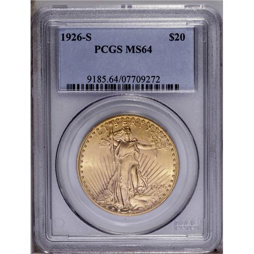 <B>1926-S<$20> MS64 PCGS.</B></I> The surfaces of this piece display rich, glowing mint frost, and each side has medium yellow-gold and green-gold coloration. Just a bit softly struck over the highpoints, but there are no singularly mentionable or distracting abrasions on either side. An especially attractive near-Gem example of this once-rare date. <BR><BR><B>Important notice:</B> Heritage usually auctions material at the rate of 200-250 lots per hour. On some occasions eBay Live bid software or the Internet may not be able to keep up with the pace of the auction. We recommend placing a realistic absentee bid now as insurance to avoid disappointment. Occasionally the auctioneer may eliminate or reject an eBay Live bid, and the auctioneer may also reopen a lot after the close of the eBay live bidding (usually because we missed an audience bid), and may reject your bid even if it shows you as the winning bidder. By bidding via eBay Live, you agree that Heritage may award the lot to another bidder at its sole discretion under the circumstances described above or any other reasonable circumstances. Since eBay bids are not shown to us until we open the lot on the floor, we treat those bids just like floor bids. In most cases the floor responds before the eBay bid is presented to us, due to Internet lag time, so for consistency we have made it a policy that floor bids are always considered first over tie eBay live bids. Also please note that all Heritage lots purchased through eBay Live carry a 20% Buyer's Premium. Please make sure you read the Terms and Conditions before you bid. This lot is being auctioned in conjunction with a live floor auction by Heritage Galleries & Auctioneers. All final auction and invoice information will be supplied by Heritage Galleries & Auctioneers, and all other information should be considered preliminary. Lot:4733 <BR><BR><B>Winning Notification and Billing:</B> After the FINAL session in this auction is complete, Heritage will send e-mail and snail mail invoices. This process normally takes several days. All final auction and invoice information will be supplied by Heritage Galleries & Auctioneers, and all other information should be considered preliminary. <BR><BR>This auction will be conducted on a live auction floor and over the Internet through eBay Live. If you choose to place an absentee bid, please take a moment to <font color='#0000ff'><u><a href='http://pages.ebay.com/liveauctions/help/before/laabsentee.html'>learn how eBay Live absentee bidding works</a></u></font><font color='#000000'>