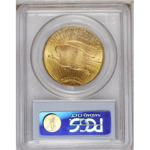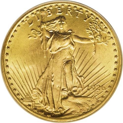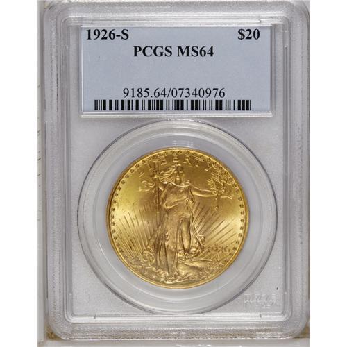 <B>1926-S $20 MS64 PCGS.</B></I> This near-gem 1926-S twenty displays gorgeous luster and apricot-gold patina that is laced with wisps of light green. Liberty's face, hands, and foot are well defined, as are the eagle's feathers. Well preserved surfaces show just a few grade-defining marks. This issue is difficult to acquire in finer grades; PCGS has seen only 22 grading higher.<BR><BR><b>Shipping:</b> Coin/Currency (<a target="_blank" href="http://www.heritageauctions.com/common/shipping.php">view shipping information</a>)
