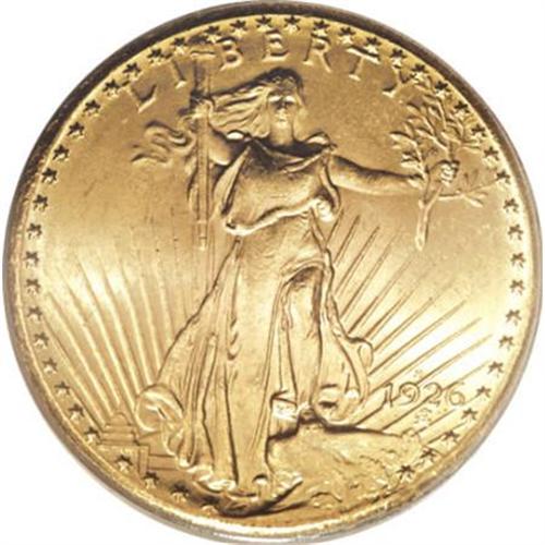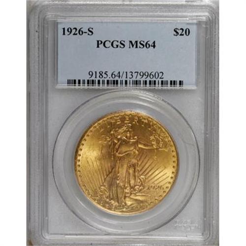 <B>1926-S $20 MS64 PCGS.</B></I> The appearance of several hoards over the past 50 years has relegated this former rarity to the more affordable range of mintmarked Saints struck in the 1920s. This is an uncommonly fine MS64 example that is close to Gem classification. The surfaces are bright and satiny with no mentionable abrasions on either side. Sharply struck throughout.<BR><BR><B>Coin Engraver:</B> Augustus Saint-Gaudens<BR><BR><b>Shipping:</b> Coins & Currency (<a target="_blank" href="http://www.heritageauctions.com/common/shipping.php">view shipping information</a>)