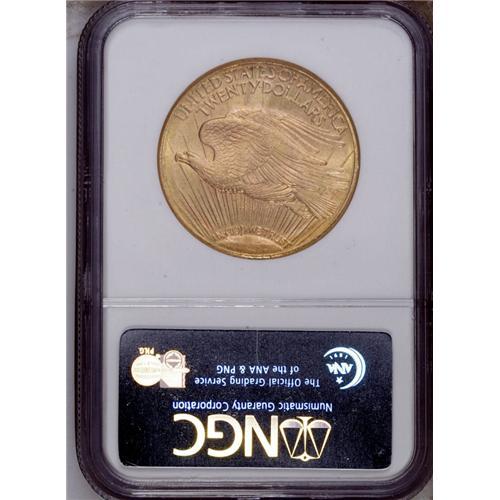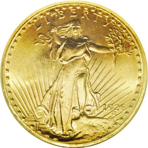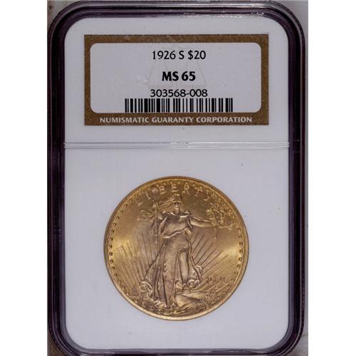 <B>1926-S<$20> MS65 NGC.</B></I> Since the repatriation of several European hoards over the past four decades, the rarity ranking of the 1926-S has been adjusted to the point that the date is now considered to be the most obtainable branch mint double eagle from the 1924-1927 era. Still, perhaps fewer than a thousand coins are believed extant from an original mintage of more than 2 million pieces, and the Mint State population dwindles precipitously above the Choice level. This high grade survivor is tinged in reddish patina and displays far fewer abrasions than the typical Uncirculated example. Census: 16 in 65, 3 finer (2/06).