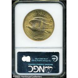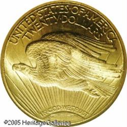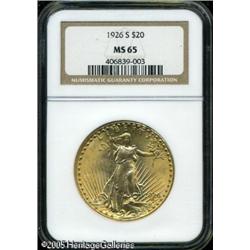 <B>1926-S $20 MS65 NGC.</B></I> The 1926-S Double Eagle, after a steady stream of migration from Europe over the past 25-30 years, is one of the more available mintmarked Saints from the 1920s. However, most of the pieces that have entered the U.S. from European sources have been marginal quality Uncs to MS63 at best. At the Gem level, the '26-S Twenty remains an extremely scarce coin. Both the strike and luster on this rich reddish-golden example are the equal of any we have seen and there are no singularly mentionable bagmarks. The obverse is free of both the peripheral bulging and the spindly die cracks that often plague survivors of this conditionally scarce S-mint. Overall, a fine candidate for the finest set of Saint-Gaudens Double Eagles. Population: 13 in 65, 3 finer (1/05). Lot:9717
