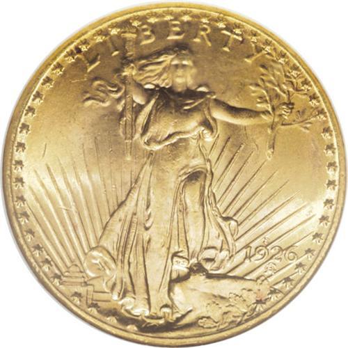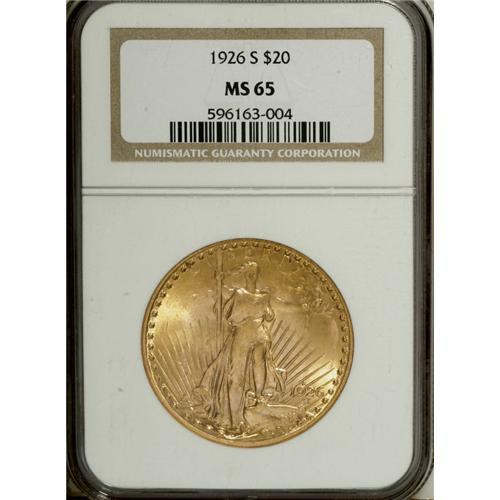 <B>1926-S $20 MS65 NGC.</B></I> The 1926-S was, at one time many years ago, considered to be among the rarest of the many elusive issues in this challenging series--and then overseas bank hoards began divulging up their long-buried treasures. But even today, most Mint State coins are at the lower end of the spectrum, and Gem coins are few and far between. This example boasts splendid deep sunset-orange surfaces with bold luster and a sharp strike. The few light abrasions are away from the prime focal points and consistent with the grade assigned. This coin represents a prime opportunity for the Saint-Gaudens specialist, as few finer coins have been graded at either service (4/07).<BR><BR><b>Shipping:</b> Coins & Currency (<a target="_blank" href="http://www.heritageauctions.com/common/shipping.php">view shipping information</a>)
