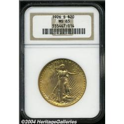 <table><tbody><tr><td><table> <TR><TD width="100%"><TABLE cellSpacing=1 cellPadding=3 width="100%" border=0><TBODY><TR><TD width="100%" bgColor=#79735c><FONT face=arial color=#ffffff size=3><B>Description</B> </FONT></TD></TR><TR><TD width="100%" bgColor=#ffffff><FONT face=arial size=2><B>1926-S $20 MS65 NGC.</B></I> Just a fraction of the coins from this issue are believed to be extant, from an original mintage of more than 2 million pieces, and the Mint State population dwindles rapidly above the Choice level. This Gem has a pleasing, nearly full strike, and also displays exceptionally appealing medium golden-orange color. The glowing satiny luster is lovely as well, if not flashy, and helps to accent the exquisitely preserved features. Three small contact marks are visible on the lower half of Liberty's figure, but the reverse only shows a few very trivial blemishes. An attractive and minimally abraded example of this mass-melted issue. Most certified 1926-S Saints fall into the MS62 to MS64 grade range, and specimens grading as high as the present example can be considered very scarce. Population: 10 in 65, 3 finer (12/03).<BR><I>From a Magnificent Collection of Double Eagles.</B></I> </FONT></TD></TR></TBODY></TABLE></TD></TR></TBODY></TABLE><BR><A name=PricesRealized></A><TABLE cellSpacing=0 cellPadding=0 width="100%" bgColor=#000000 border=0><TBODY><TR><TD width="100%"><TABLE cellSpacing=1 cellPadding=3 width="100%" border=0><TBODY><TR><TD width="100%" bgColor=#79735c><A name=PR><FONT face=arial color=#ffffff size=3><B>Previous Prices from Heritage Auctions</B> </FONT></A></TD></TR><TR><TD bgColor=#f6f6ed>No Prior Data Recorded </TD></TR><TR><TD bgColor=#ffffff><FONT face=arial size=1 ?>PLEASE NOTE: All prices realized reflect the final hammer price PLUS the buyer's premium in auctions that charge a buyer's premium. Each item has a notation at the top of the listing indicating whether that lot included a buyer's premium. Example: A item that sells with a final hammer price of $100 and a 20% buyer's premium will display with a price realized of $120. All information listed is intended to be as accurate as possible, but errors are possible. Please use this guide carefully and inform us of any inaccuracies. </FONT></TD></TR></TBODY></TABLE></TD></TR></TBODY></TABLE><BR><TABLE cellSpacing=0 cellPadding=0 width="100%" bgColor=#000000 border=0><TBODY><TR><TD width="100%"><TABLE cellSpacing=1 cellPadding=3 width="100%" border=0><TBODY><TR><TD width="100%" bgColor=#79735c colSpan=6><FONT face=arial color=#ffffff size=3><B>Price Guide*</B> </FONT></TD></TR><TR bgColor=#f6f6ed><TD align=middle><B>Grade</B> </TD><TD align=middle><B>Coin World<BR>(Trends)</B> </TD><TD align=middle><B>Numismedia<BR>Retail</B> </TD><TD align=middle><B>Numismedia<BR>Wholesale</B> </TD><TD align=middle><B>Coin<BR>Universe</B> </TD><TD align=middle><B>Heritage<BR>Value Index</B> </TD></TR><TR bgColor=#ffffff><TD align=middle>64</TD><TD align=right>$7,500.00</TD><TD align=right>---</TD><TD align=right>$5,275.00</TD><TD align=right>$5,800.00</TD><TD align=right>$4,634.75</TD></TR><TR style="FONT-WEIGHT: bold" bgColor=#cccfdd><TD align=middle>65</TD><TD align=right>$40,000.00</TD><TD align=right>---</TD><TD align=right>$25,500.00</TD><TD align=right>$36,500.00</TD><TD align=right>$25,650.00</TD></TR><TR bgColor=#ffffff><TD align=middle>66</TD><TD align=right>---</TD><TD align=right>---</TD><TD align=right>$45,500.00</TD><TD align=right>---</TD><TD align=right>$42,500.00</TD></TR><TR bgColor=#ffffff><TD colSpan=6><FONT size=1>*All information listed is intended to be as accurate as possible, but errors are possible. No item may be returned or refused based on this information which is provided as a service to our customers. You should contact each pricing source directly to determine the accuracy of this information. </FONT></TD></TR></TBODY></TABLE></TD></TR></TBODY></TABLE><BR><TABLE cellSpacing=0 cellPadding=0 width="100%" bgColor=#000000 border=0><TBODY><TR><TD width="100%"><TABLE cellSpacing=1 cellPadding=3 width="100%" border=0><TBODY><TR><TD width="100%" bgColor=#79735c><FONT face=arial color=#ffffff size=3><B>Population Guide</B> </FONT></TD></TR><TR bgColor=#ffffff><TD align=middle><!-- Begin Output of Population Grid--><TABLE cellSpacing=0 cellPadding=0 width="100%" border=0><TBODY><TR><TD vAlign=center><TABLE cellSpacing=0 width="100%" border=1 cellsadding="3"><TBODY><TR><TD vAlign=center><TABLE cellSpacing=0 cellPadding=3 width="100%" border=1><TBODY><TR><TD vAlign=center align=middle bgColor=#f0f1e8 colSpan=2 <CENTER><FONT face=Arial size=2><B>PCGS Pop </B></FONT><CENTER></CENTER></TD><TD vAlign=center align=middle bgColor=#f0f1e8 colSpan=2><CENTER><FONT face=Arial size=2><B>NGC Pop</B></CENTER></FONT></TD></TR><TR><TD vAlign=center><FONT face=Arial size=2>(65)</FONT> </TD><TD vAlign=center align=right><FONT face=Arial size=2>10</FONT> </TD><TD vAlign=center><FONT face=Arial size=2>(65)</FONT> </TD><TD vAlign=center align=right><FONT face=Arial size=2>10</FONT> </TD></TR><TR><TD vAlign=center><FONT face=Arial size=2>(>65)</FONT> </TD><TD vAlign=center align=right><FONT face=Arial size=2>1</FONT> </TD><TD vAlign=center><FONT face=Arial size=2>(>65)</FONT> </TD><TD vAlign=center align=right><FONT face=Arial size=2>3</FONT> </TD></TR></TBODY></TABLE></TD></TR></TBODY></TABLE></TD></TR></TBODY></TABLE><!-- End Output of Population Grid--></TD></TR></TBODY></TABLE></TD></TR></TBODY></TABLE><BR><TABLE cellSpacing=0 cellPadding=0 width="100%" bgColor=#000000 border=0><TBODY><TR> <font color='#000000'><span style='background-color: #FFFFFF'><td bgcolor='#FFFFFE'> Important notice: Heritage usually auctions material at the rate of 200-250 lots per hour. On some occasions eBay Live bid software or the Internet may not be able to keep up with the pace of the auction. We recommend placing a realistic absentee bid now as insurance to avoid disappointment. Occasionally the auctioneer may eliminate or reject an eBay Liv