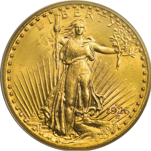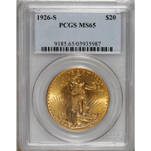 <B>1926-S $20 MS65 PCGS.</B></I> Despite a relatively high mintage of 2 million coins, the 1926-S is a challenging date to locate in Gem or better condition. Most of this issue was melted in the 1930s due to events tied to the Great Depression. The 1926-S Saint-Gaudens double eagles that escaped the melting pots, including examples returned to the United States from European bank hoards in recent decades, were handled with little care and usually display bagmarked surfaces. As such, this date is rare in grades above MS64. In fact, PCGS has bestowed the Gem grade to only 24 examples of this date (4/07), a figure probably somewhat inflated due to resubmissions. The handful of Gem examples that survived likely originated with wealthy collectors of that era with enough foresight and financial wherewithal to obtain--and retain--an example or two. This specimen offers attractive sunset-orange surfaces on each side, with cascading cartwheel luster and a noteworthy lack of singular abrasions. The bold strike has brought up all major details well, although minor softness is seen on the Capitol building. Population: 24 in 65, 2 finer (4/07).<BR><BR><b>Shipping:</b> Coins & Currency (<a target="_blank" href="http://www.heritageauctions.com/common/shipping.php">view shipping information</a>)
