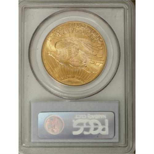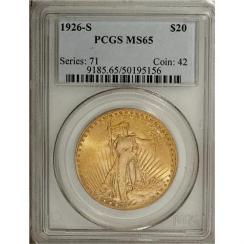 <B>1926-S $20 MS65 PCGS.</B></I> The overall scarcity of the 1926-S double eagle has diminished over the past few decades, thanks to the repatriation of coins held in European vaults since the 1930s. Still, even after this influx, Choice Mint State examples remain difficult to locate and Gems, including the coin offered here, are highly elusive in the contemporary marketplace.<BR> Both sides of this vibrant, satiny example have escaped any serious abrasions and are draped in instantly appealing reddish-orange patina. Interesting peripheral die cracks are present through the RTY of LIBERTY on the obverse and at the left side of the reverse. In sum, an enticing example of an elusive late-date branch mint Saint-Gaudens twenty. Population: 25 in 65, 2 finer (11/07).<BR><I>From The Jacob Collection of Saint-Gaudens Double Eagles.</B></I><BR><BR><B>Coin Engraver:</B> Augustus Saint-Gaudens<BR><BR><b>Shipping:</b> Coins & Currency (<a target="_blank" href="http://www.heritageauctions.com/common/shipping.php">view shipping information</a>)